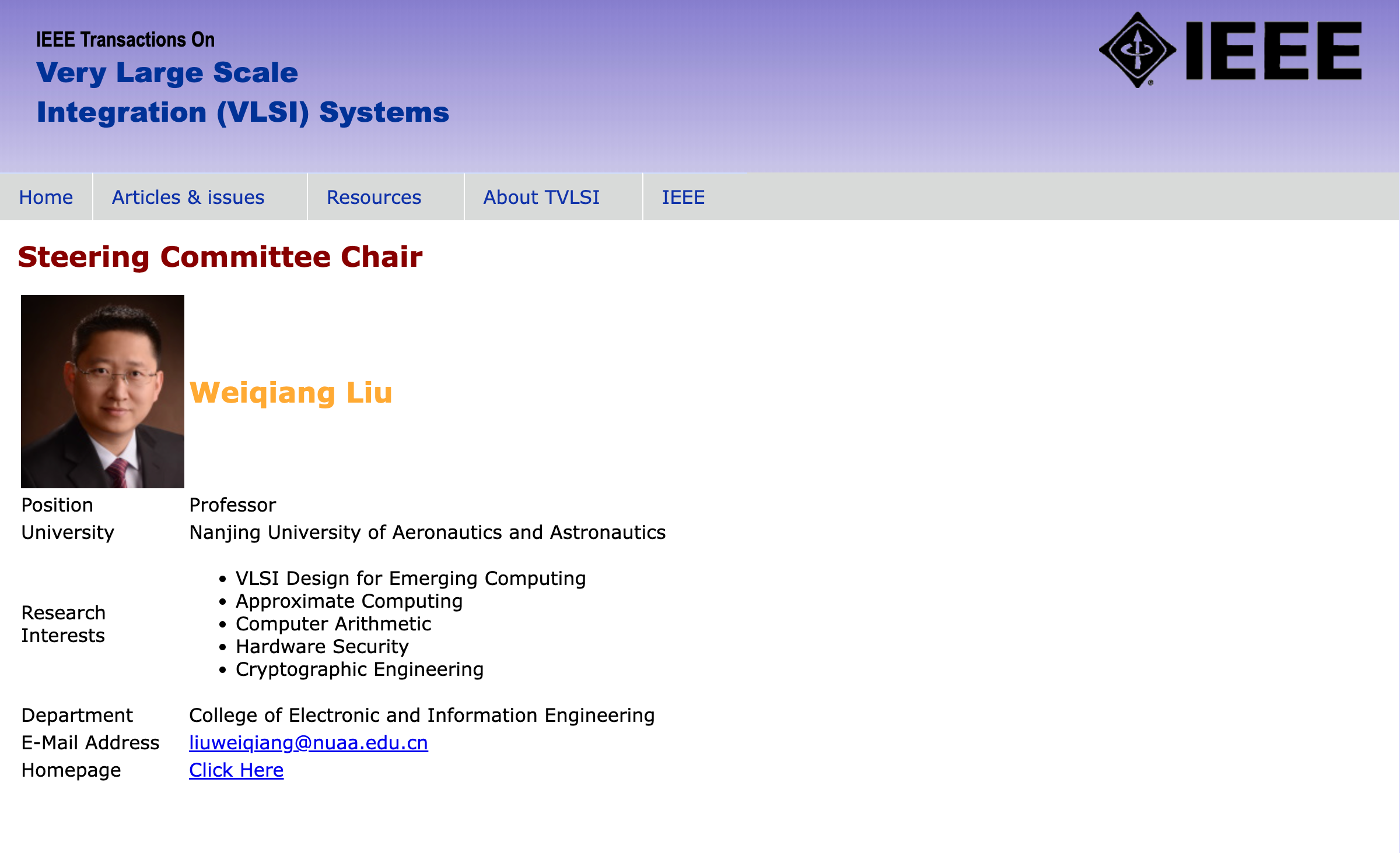 近日,IEEE Computer Society任命91pinse 刘伟强教授为最新一届IEEE Transactions on Very Large Scale Integration System (TVLSI)期刊指导委员会主席(Steering Committee Chair),首期任期为2023.1-2024.12。本届指导委员会共有五名委员,其他四位委员包括:美国斯蒂文斯理工学院的Bryan Ackland教授(IEEE Fellow、ISSCC执行委员会委员、DAC 2002主席)、法国里昂中央理工学院Alberto Bosio教授(欧洲测试技术委员会ETTTC主席)、意大利卡拉布里亚大学Pasquale Corsonello教授(TVLSI前副主编AEiC)、埃及开罗美国大学Yehea Ismai教授(IEEE Fellow、TVLSI前主编)。TVLSI指导委员会负责遴选期刊主编、监督财务及运行情况等重要事项。指导委员会主席负责TVLSI期刊指导委员会的运行和总体协调等。