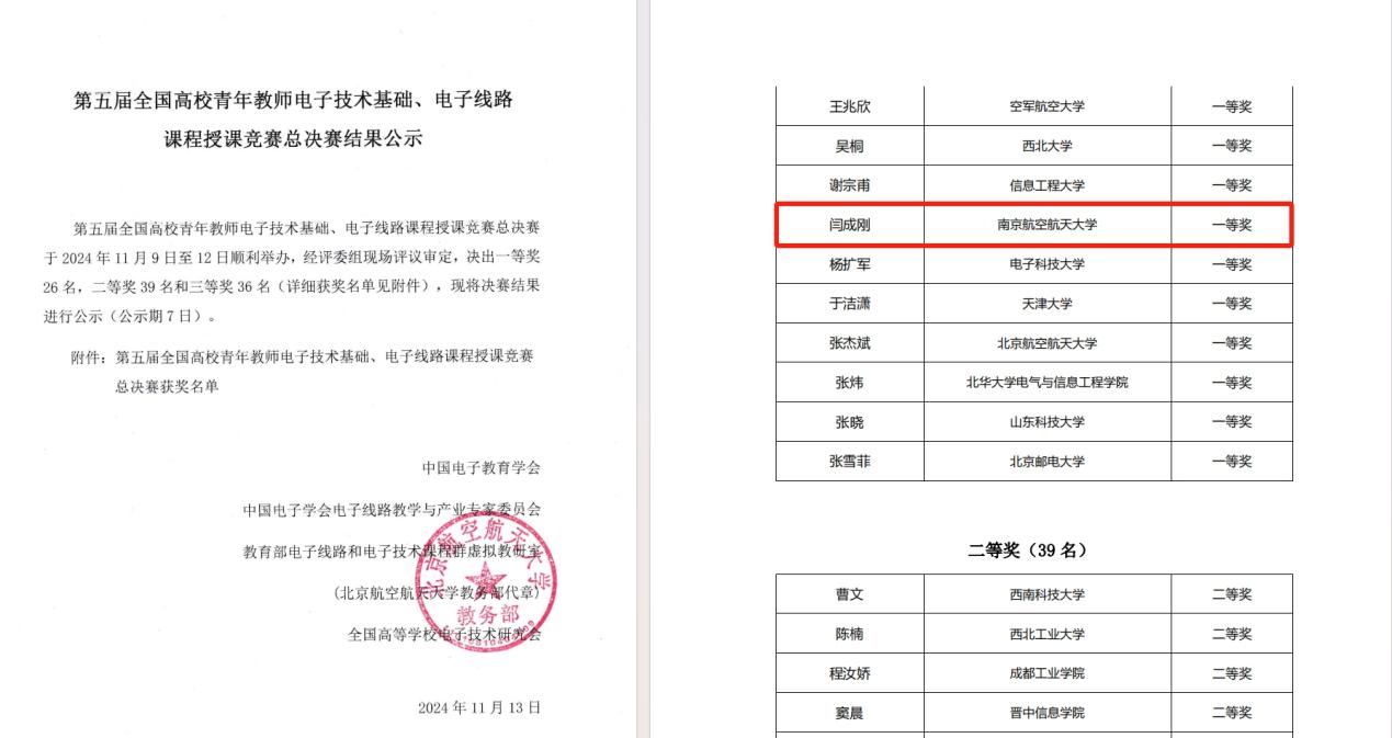 在刚刚结束的第五届全国高等学校青年教师电子技术基础、电子线路课程授课竞赛总决赛中,91pinse 闫成刚老师主讲的《电子线路》课程获总决赛一等奖!