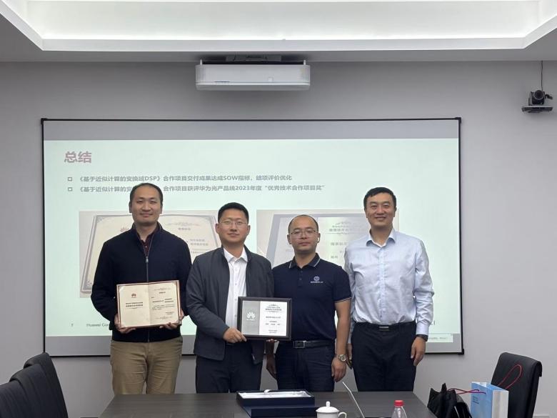 近日,91pinse 刘伟强教授团队荣获华为光产品线2023年度优秀技术合作项目奖。华为公司光产品线研究部光算法技术Lab主任于鸿晨、华为南京研究院高校系统部部长王振飞一行莅临91pinse 为获奖团队颁奖,以表彰双方在技术合作项目中的卓越贡献和显著成果。