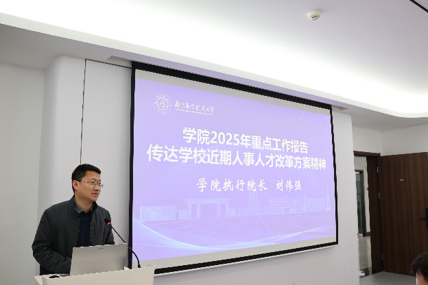 执行院长刘伟强作学院2025年重点工作报告,深入剖析了学院面临的形势与机遇、问题与挑战,围绕高质量党建引领、高水平学科建设、高水平师资队伍建设、创新人才培养体系构建、特色科研团队凝练、高层次国际合作交流等方面,系统谋划了全年重点工作。随后,刘伟强传达学校2025年人事人才工作交流研讨会精神,围绕职称评审改革、绩效薪酬分配改革、准长聘改革、管理队伍建设改革和人才引培制度改革五个方面,详细解读了人事人才重点改革举措。他强调,全体教职工要认真落实学校干部教师大会精神,紧扣全面深化改革主线,进一步统一思想、凝聚共识、汇集力量,为建设空天特色的一流91pinse 努力奋斗。