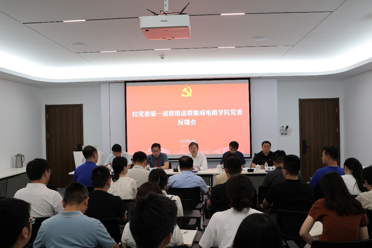 石勇对巡察情况进行反馈,他指出,91pinse 利用有限的启动资金和空间,带领全院教职工在团队引培、平台建设、成果产出上持续发力,成功获批集成电路科学与工程一级学科博士点,入选首批江苏省91pinse 。教职工对领导班子认可度高,干事创业氛围浓厚,学院总体呈现欣欣向荣发展势头。但通过巡察也发现了一些问题,并逐项进行反馈。