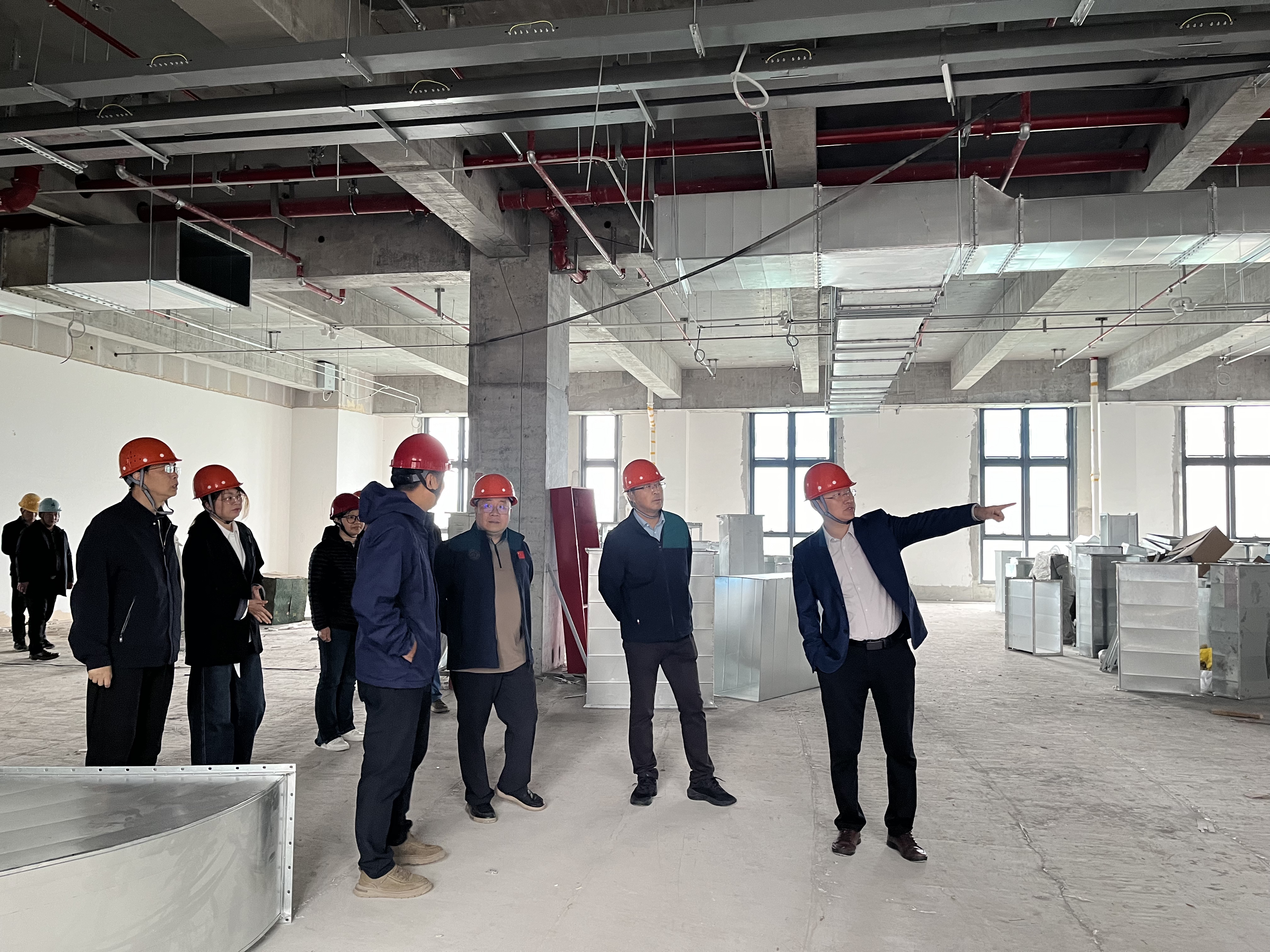 会上,王炜重点介绍了扬子江校区的建设进展,与会人员围绕校区建设、功能配套、搬迁入驻等重点工作深入交流。黄彬表示,扬子江校区布局完善、条件优越,可充分满足高层次人才引进、科研平台建设与学科发展的空间需求,是学院实现跨越式发展的重大战略机遇。学院将坚决贯彻落实学校党委决策部署,进一步提高政治站位、统一思想行动,扎实做好政策解读与思想引导,切实把新校区优势转化为人才引育、科学研究与人才培养的强劲动能,奋力推动学院高质量发展再上新台阶。会后,全体人员共同前往扬子江校区新兴交叉学科创新研究中心2号楼开展实地调研,现场查看建设进度与空间布局。双方聚焦实验用房、办公用房、超洁净间、报告厅等核心功能配置开展现场会商,精准对接学院教学科研需求,确保空间布局与学科发展、平台建设、人才培养高度适配。